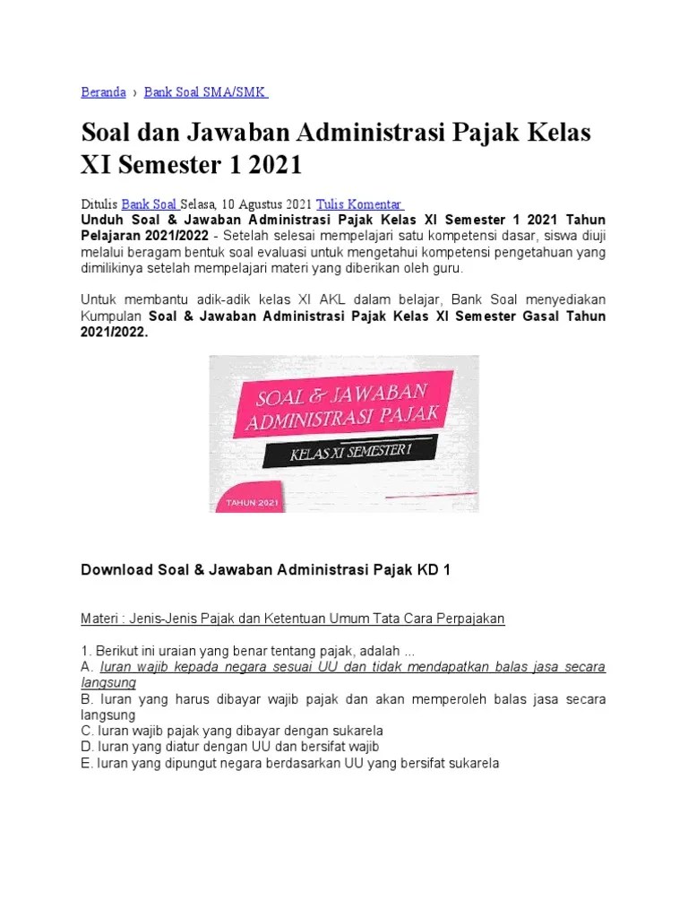 Administrasi pajak silvia rachman, s.pd klik unduh materi & tugas. Buku administrasi pajak (kompetensi keahlian akuntansi dan keuangan lembaga, kompetensi keahlian perbankan dan keuangan mikro)) untuk smk/mak kelas xi ini . Yang menyediakan berbagai macam koleksi buku cetak dan digital perpustakaan yang dapat dipinjam oleh seluruh civitas akademia di smk negeri 1 bawang. Ringkasan bab 1 adm pajak kelas xi. Fungsi pajak 12.pph pasal 22 3. Pengelolaan pajak, terdiri dari 13.pph pasal 23 pajak penghasilan 14. Pengolongan pajak pengertian pajak 11.pph pasal 21 2. Negara berhak mengenakan pajak penghasilan bersumber atas daerahnya tanpa memperhatikan tempat tinggal tetapi berdasarkan negara pengertian . Secara umum, pengertian pajak adalah iuran atau kontribusi wajib dari rakyat, baik perseorangan atau badan usaha, kepada negara . Download soal & jawaban administrasi pajak kd 1. Rangkuman materi pajak smk ii. Mengkaji materi bab 4 perkembangan islam pada masa modern. 127 surat pemberitahuan pajak xi xii modul paket keahlian akuntasi sekolah menengah .